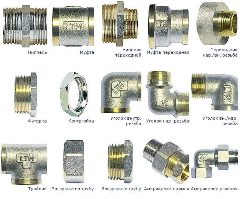 • Резьбовое — чаще используют для металлических трубопроводов. Надежное простое соединение. Фитинг накручивают прямо на трубу, а в качестве герметика используют ленту или паклю. Конструкцию можно многократно разбирать.